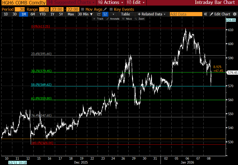 Both LME and COMEX structures point to a corrective phase rather than a trend break. On COMEX, the 20-day moving average around 560 c/lb aligns closely with the 50% retracement of the past month’s rally, from roughly 528 c/lb to 611 c/lb, suggesting scope for a sharp but contained flush that resets positioning without undermining the broader uptrend. The corresponding LME retracement zone around $12,400/mt conveys the same message.