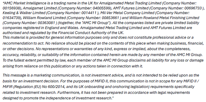 Inventories: LME stocks remain critically low at 2,670 mt, with the latest decline of 105 mt representing nearly 4% of total inventory. Cancelled warrants now account for 17% of available metal, signalling further potential withdrawals. With such thin exchange stocks, single-day shifts of this scale, when combined with supply-limiting headlines, inevitably add to price nervousness.